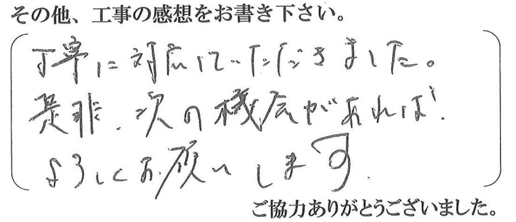 この度は、浴室・洗面工事をご依頼頂き誠にありがとうございました。お住まいの事でご不便や不具合感じられましたら、遠慮なく当社にご相談下さいませ。今後共どうぞよろしくお願い致します。
