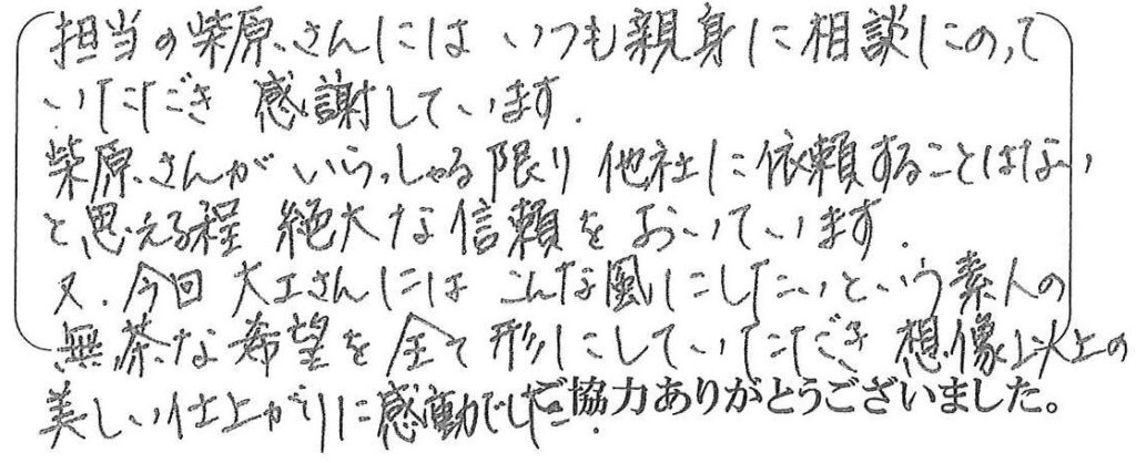 いつもリフォームをご依頼下さいましてありがとうございます。今回はキッチンと窓断熱工事をさせて頂きましたが、ご希望通りの仕上がりで納める事が出来、また工事中も仕事がし易いようご協力頂き心より感謝しております。大工をはじめ各職方でチームワークよく進める事が出来、安心しております。今後共、どうぞよろしくお願い致します。