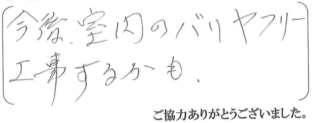 この度は当社に手すりの取付工事をご依頼下さりありがとうございました。駐車場や門扉から玄関までの出入りが楽になったとの事で良かったです。今後室内のバリアフリー工事をされる際は、お気軽にお申し付けください。今後共どうぞよろしくお願い致します。