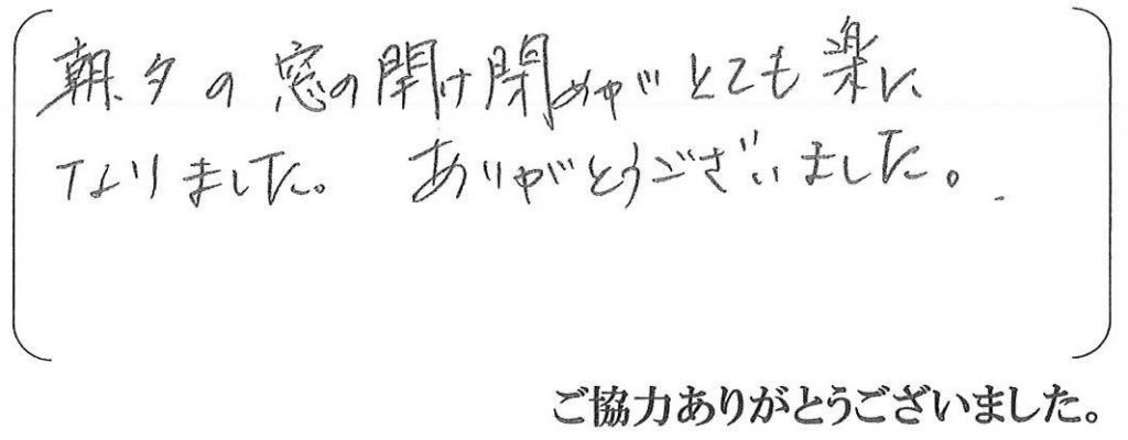 この度は雨戸シャッターにお取替えさせて頂きました。毎日の開け閉めがとても楽になったとの事で、うれしいご感想をありがとうございました。今後ともお住まいの事なら何なりとお申し付けください。