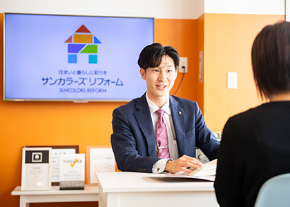 サンカラーズリフォームの最大の強みは、人間力です。「誠実と努力」という社訓から、お客様の喜びを自分の喜びとする姿勢や価値観を持ったスタッフが揃っています。お客様からは、スタッフの人柄や柔軟性のある対応、誠実さから、当社を選んだとのお声もよくいただきます。リフォームを通して、関わる全ての人を幸せにできるよう、これからも、日々努めて参ります。