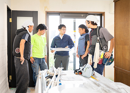 同じだから安心はじめましてからお引渡しまで担当者は変わりません。担当の営業マンがご契約・現場管理・お引渡しまで責任を持つ、営業工務一貫体制ですので、最初から最後まで同じスタッフとコミュニケーションを取ることができます。また、営業や設計、職人がチーム一丸となってお客様のリフォームをご提案・サポートさせていただきますので、安心してお任せください。