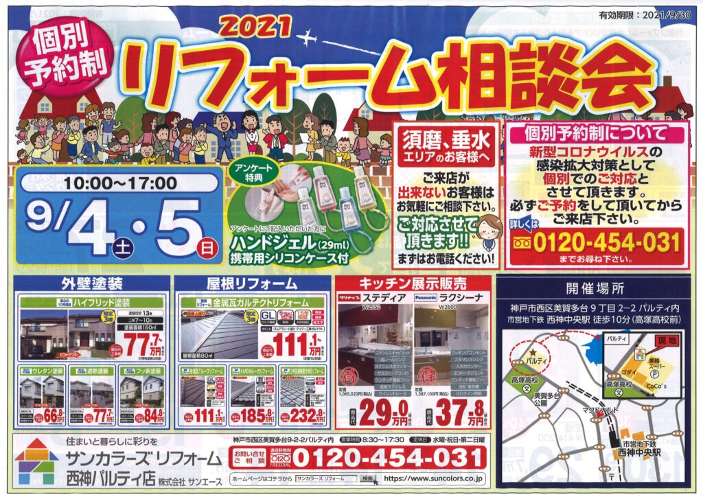 9/4(土)9/5(日)西神パルティ店にてリフォーム相談会を開催いたします。 個...