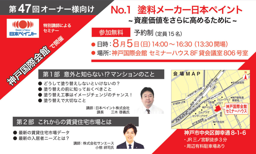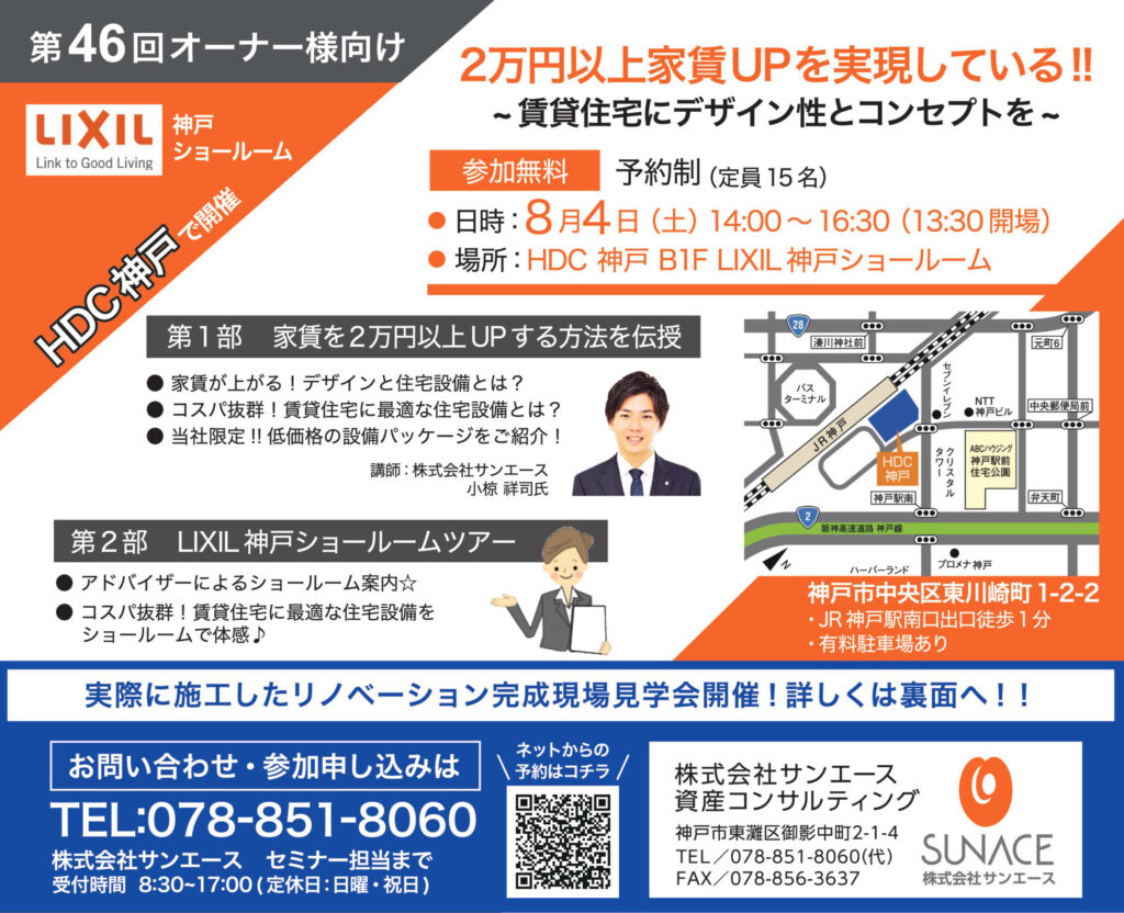 第46回オーナー様向け「家賃2万円以上UPを実現!」セミナー開催 日時:8/4(...