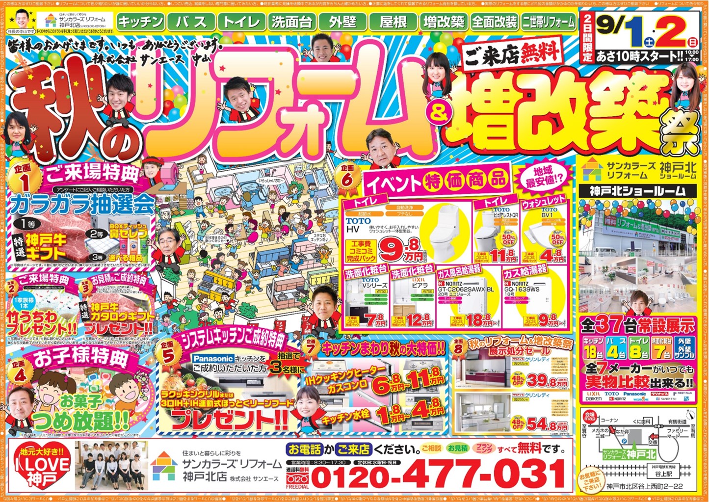 9月1日(土)・9月2日(日) の2日間、サンカラーズリフォーム神戸北店にて秋のリフォーム&増改築祭を開催いたします。