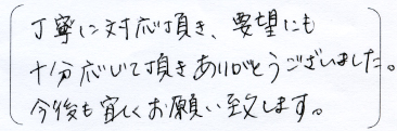 ありがとうございます。お客様に満足して頂けるよう対応していく事をモットーにしております。