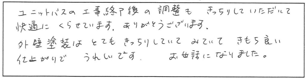 外壁塗装と浴室リフォームでお世話になりました。末永く快適にお住まい頂けるよう、引き続きしっかり頑張って参ります。今後ともどうぞよろしくお願い致します。
