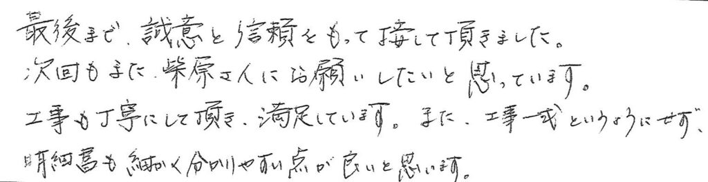 システムバス・トイレ・洗面の工事をご依頼頂きましてありがとうございました。工事中もご協力頂き、予定通り進める事ができ、職人共々大変気持ちよく仕事をさせて頂きました。今後ともよろしくお願いいたします。