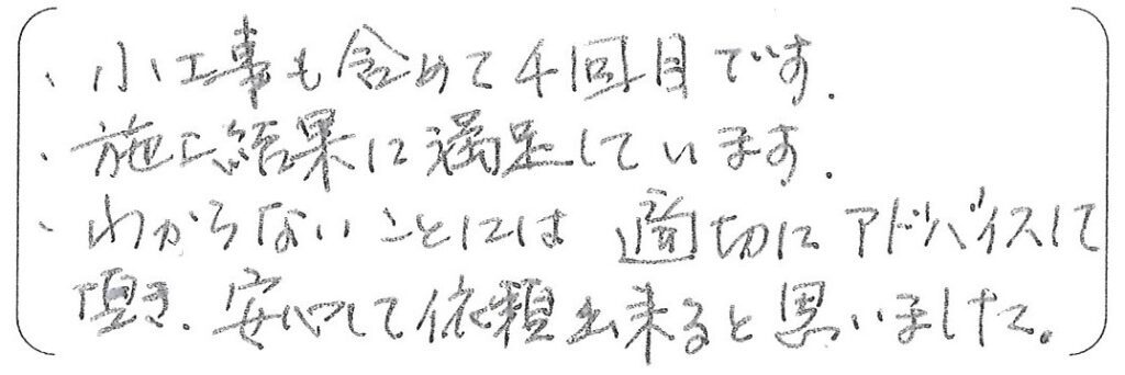 今回は、内装工事をご依頼頂きありがとうございました。今回も施工等にご納得頂けましたこと嬉しく思っております。ご期待に応えられるよう、頑張らせて頂きますので、今後ともよろしくお願い致します。