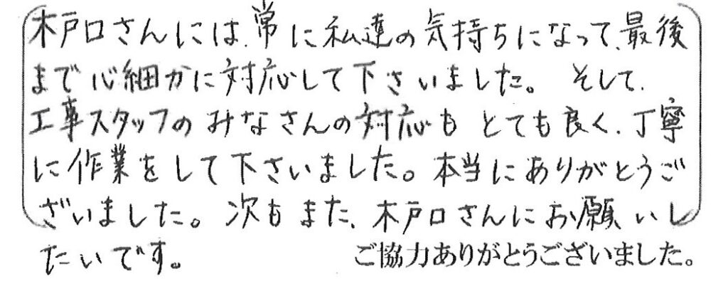 この度はありがとうございました。10年~15年に一度の外壁塗装ですので、足場があるうちにできることはしておきたいと思いながら職人さんも作業をしております。またお力になれることがございましたら、お声掛け下さいませ。