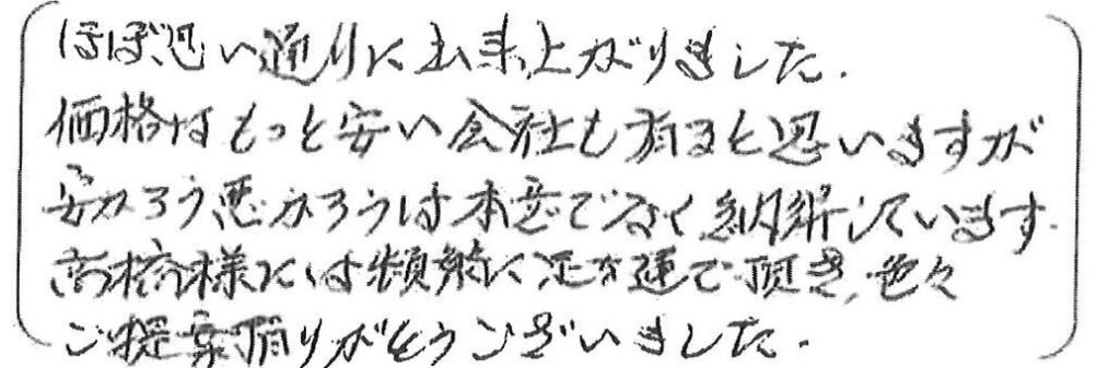 事前の打ち合わせで時間を取って頂き、工事がスムーズに行えました。ありがとうございました。