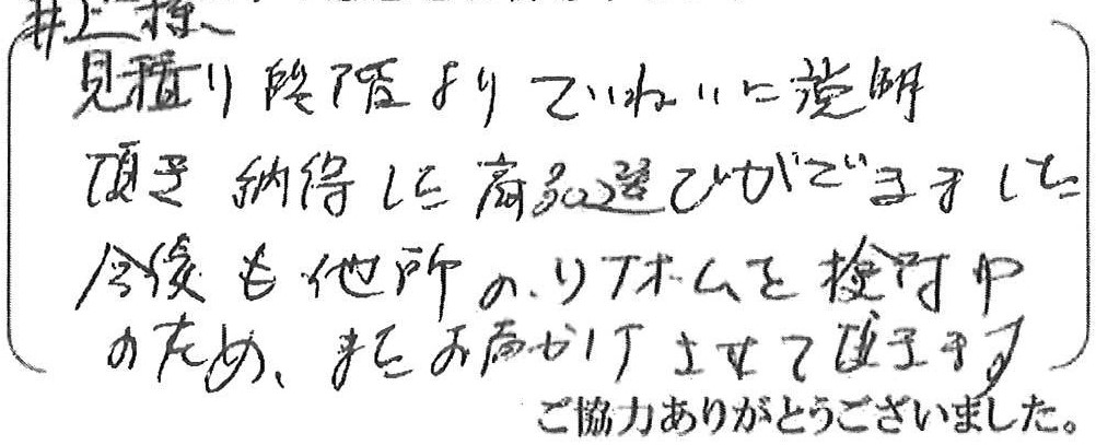 この度は洗面所工事をご依頼いただき、ありがとうございました。とても素敵な空間に仕上がり、私も嬉しく思います。ご相談だけでも全然構いませんので、今後も何でもお気軽にお声かけください。