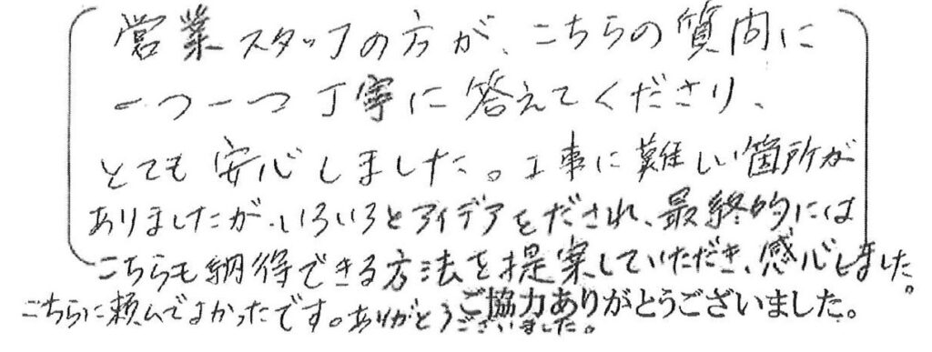 この度はキッチン工事をご依頼頂きましてありがとうございました。各商品をじっくり比較検討いただき、最適なリフォームをご提供することができました。今後共どうぞよろしくお願い致します。
