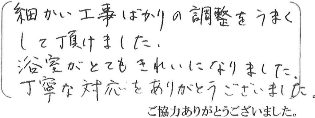 浴室内のシール打替、シャワー取替、ブラインド取替、照明取替、網戸張替をさせて頂きました。各職人さんと連携をとるのも我々の仕事ですので安心してお任せ下さい。