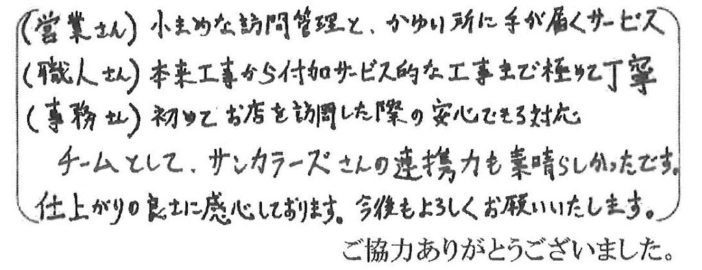 今回、はじめての外壁塗装工事をご依頼頂きまして誠にありがとうございました。五分艶仕上げの外壁色を満足して頂いて本当にありがとうございます。今後共よろしくお願い致します。