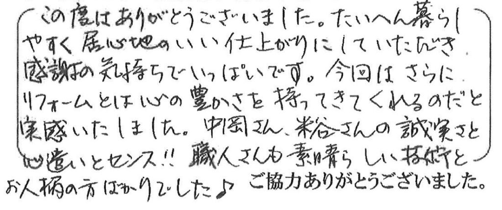 今回はキッチンをI型から対面にさせて頂きましたが、“こういった風な暮らしがしたい!”と明確なイメージがございましたので楽しくプランさせて頂きました。有難いお言葉大変嬉しく恐縮です。