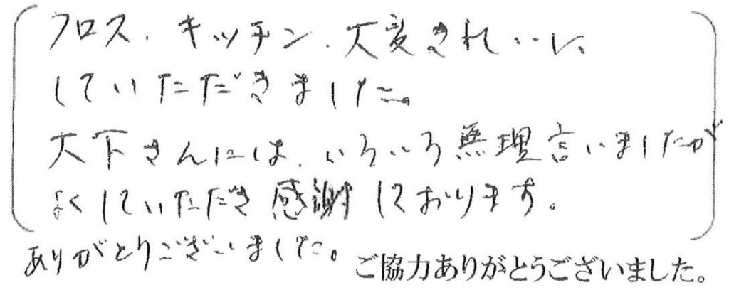 この度はお世話になり有難うございました。当初は、キッチンの設備機器の入替から始まり、ご相談させて頂く中でキッチン本体の入替となりました。時間をかけて進めさせて頂いたのでお客様との距離も縮まり、工事の際もスムーズに進めさせて頂く事が出来ました。