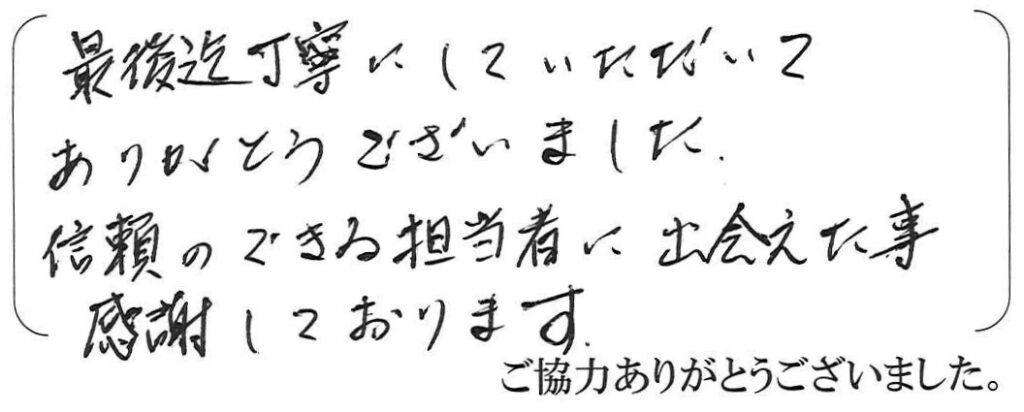 今回は浴室、トイレ、キッチンの工事をさせていただきました。工事中はご迷惑をおかけする場面もあり、申し訳ございませんでした。最後にはご満足いただけて本当に良かったです。ご夫婦とのお話はとても楽しく、ご訪問のたびに元気をいただいておりました。今後ともお気軽にお声掛けくださいませ。