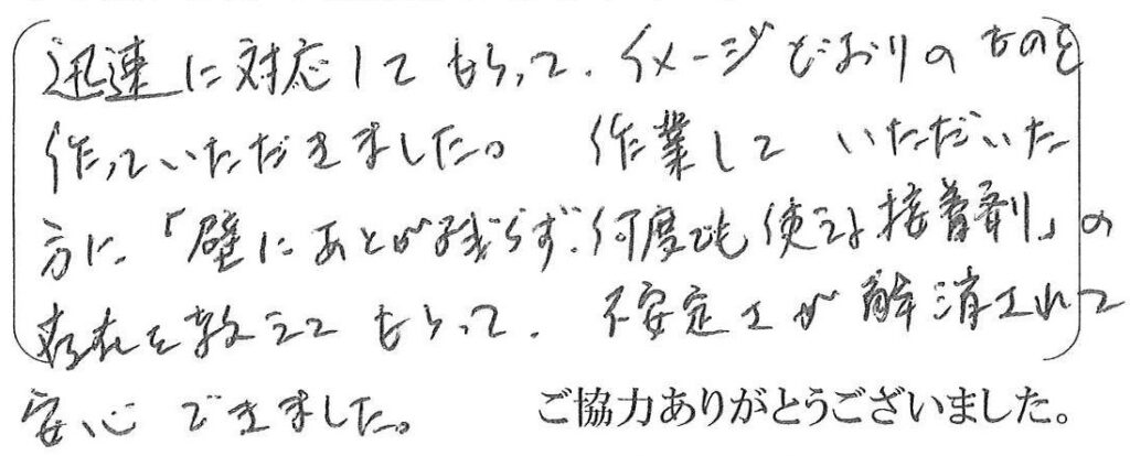 この度は和室壁に造作棚取付工事のご依頼誠に有難うございました。ご要望通りの棚が取付できてよかったです。ご趣味の絵画の展示がたくさんでき、作品を楽しんで頂けることを願っております。今後共宜しくお願い致します。