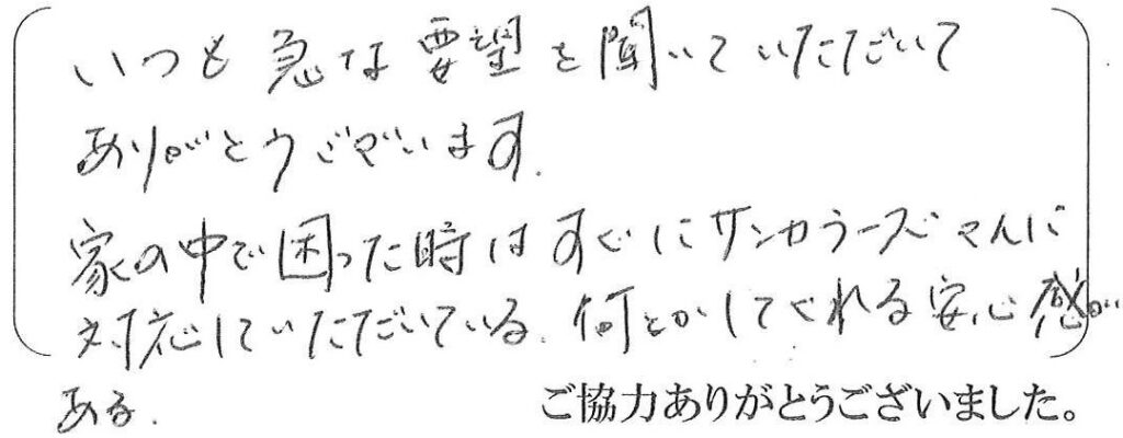 いつもご依頼ありがとうございます。急な配管の詰まりで、洗管にて対応させて頂きました。解決でき、良かったです。今後ともよろしくお願い致します。