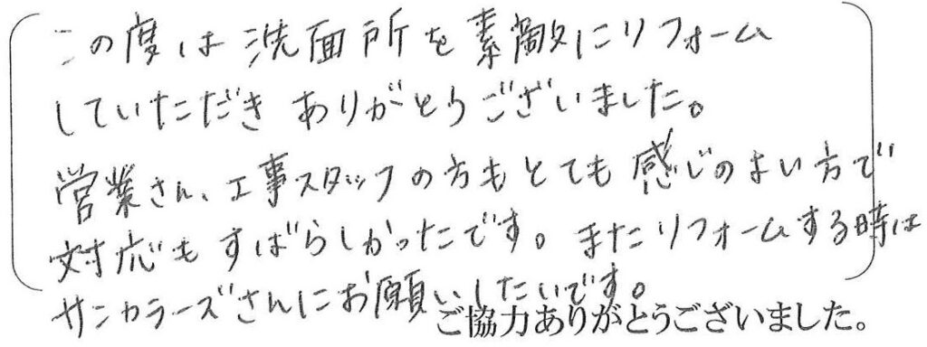 この度は洗面化粧台取替工事をご依頼頂き誠に有難うございました。お施主様自ら塗られた天然素材の塗料にもマッチしたいい洗面室になったと思います。今後共宜しくお願い致します。