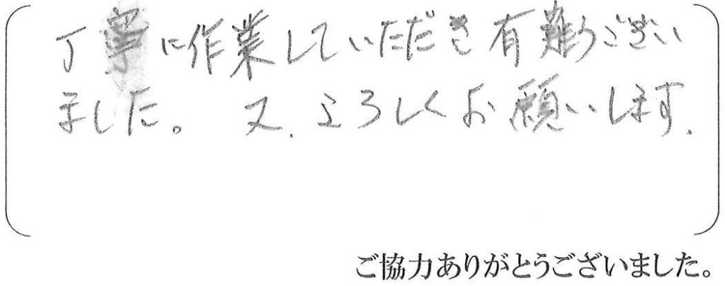 この度は、浴室暖房乾燥機とインターホンの取替工事をご依頼頂き、誠にありがとうございました。どんなことでも、お客様第一で対応をさせて頂きます。また何かございましたら、遠慮なくお声掛け下さい。今後ともよろしくお願い致します。