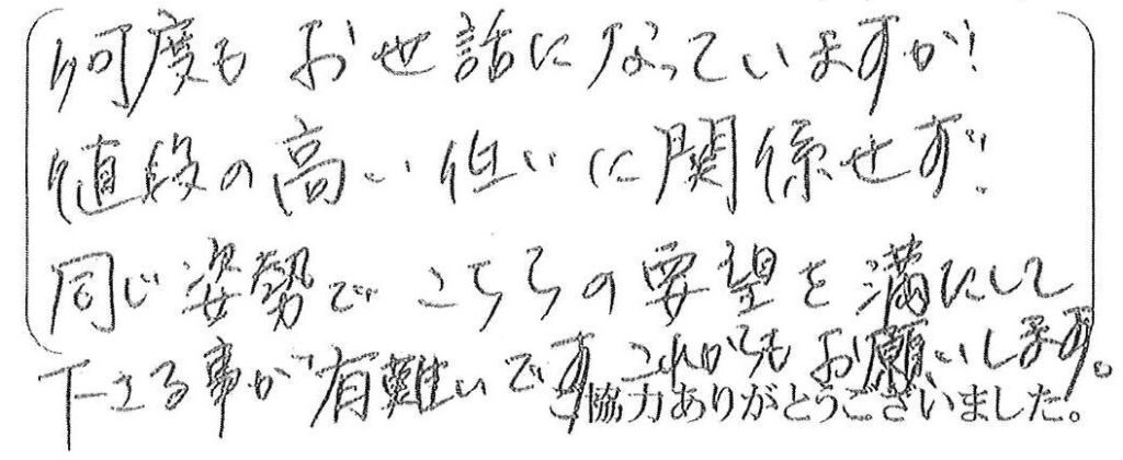この度は鍵の交換工事をご依頼頂き、ありがとうございます。住まいの事ならどんな事でも当社にお任せ下さい。今後共よろしくお願い申し上げます。