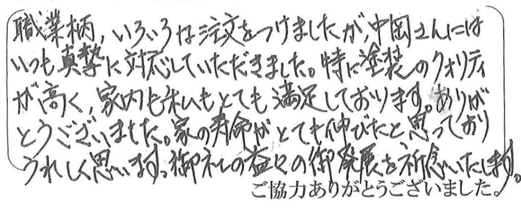 この度は屋根・外壁塗装をご依頼頂きましてありがとうございました。途中ご指摘頂きました内容等は“お客様がどういったことを気にされているか”という点において私も勉強にさせて頂くことが出来ました。塗装も塗分け箇所が多く、養生やラインの美しさで職方の腕を魅せることが出来たと存じます。また、どうぞよろしくお願い致します。