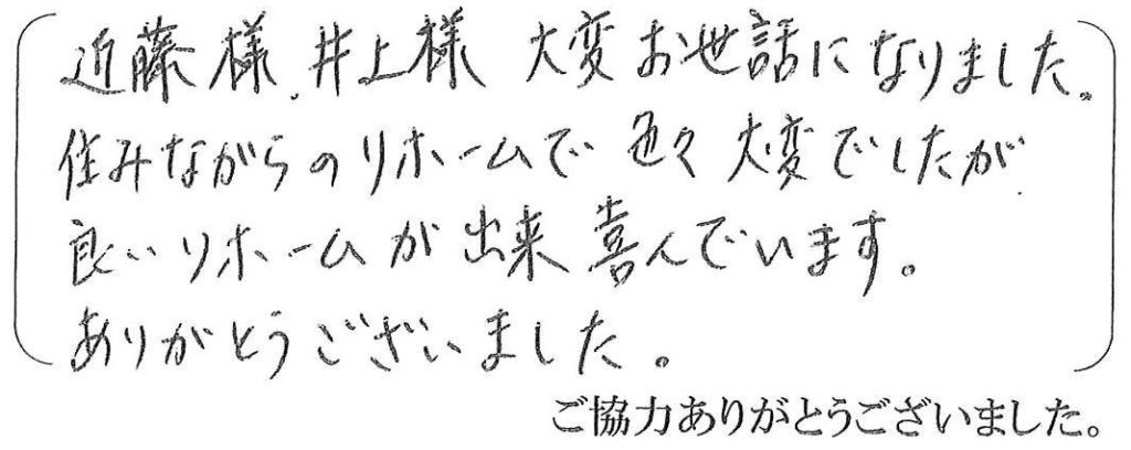今回はマンションの間取り変更を伴う内装工事とキッチン入替工事をさせていただきました。ご在宅の中、ご不便をおかけする場面もございましたが、ご協力誠にありがとうございました。おかげ様で素敵な仕上がりになり、私共も非常に嬉しく存じます。今後ともよろしくお願いいたします。