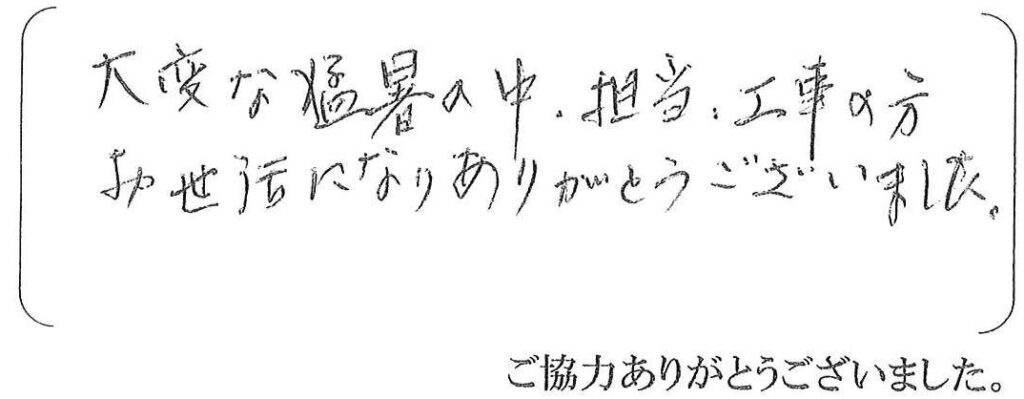 この度はマンションユニットバス取替のご依頼を賜り、ありがとうございました。大きなお買い物になりますので、この先快適にお過ごし頂く為のお手伝いをさせて頂きました。またお使い勝手を伺わせて下さい。今後共よろしくお願い致します。