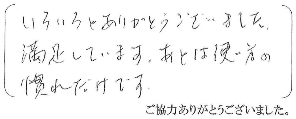 この度は、ガレージの門扉を交換させて頂きました。強風で傷んだ時は壊れた門扉が出入りを妨げ、お困りでした。新しい門扉は動作が変わりましたが、お使い頂く事で慣れて頂けると思います。もし何かございましたらご連絡下さい。今後共宜しくお願い申し上げます。