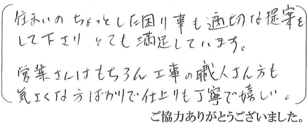 この度は工事をご依頼頂き、ありがとうございました。長年のお付き合いをさせて頂いているお客様です。今回は畳と下駄箱の丁番取替などをさせて頂きました。仕上がりにご満足頂き、私も嬉しく思います。今後共、お家の事でお困り事などございましたら、ご遠慮なくご相談ください。