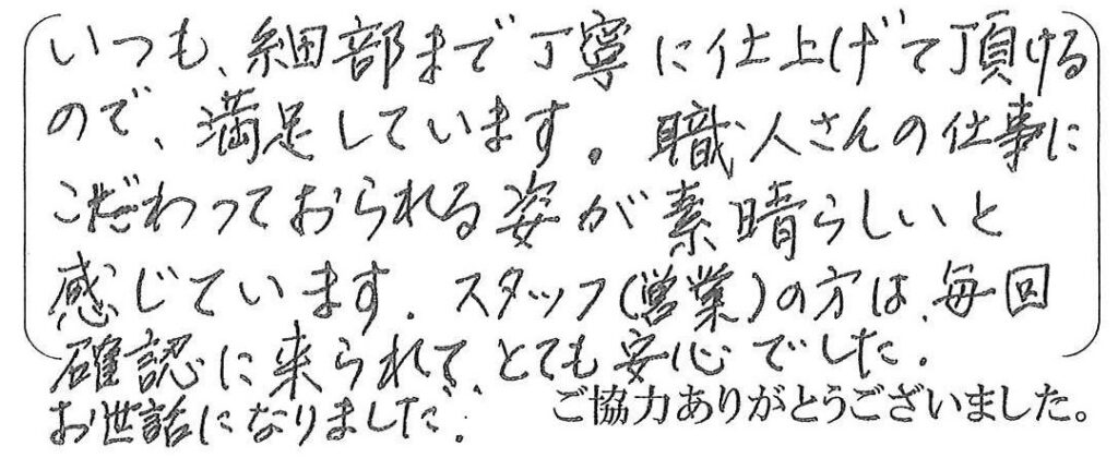 この度は工事のご依頼を頂き、ありがとうございました。長年のお付き合いをさせて頂いているお客様です。今回は塀と玄関ドアの塗装工事をさせて頂きました。ご満足頂けて、私も嬉しく思います。今後共、お家のことでしたらご遠慮なくご相談ください。