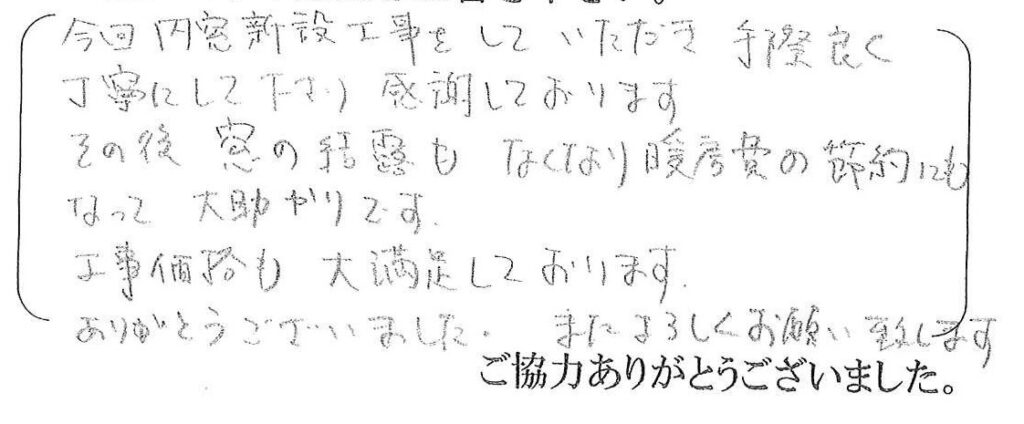 いつもリフォーム工事をご依頼下さいましてありがとうございます。内窓の効果があって良かったです。今後もリフォームの事なら何でもお気軽にお申し付けください。