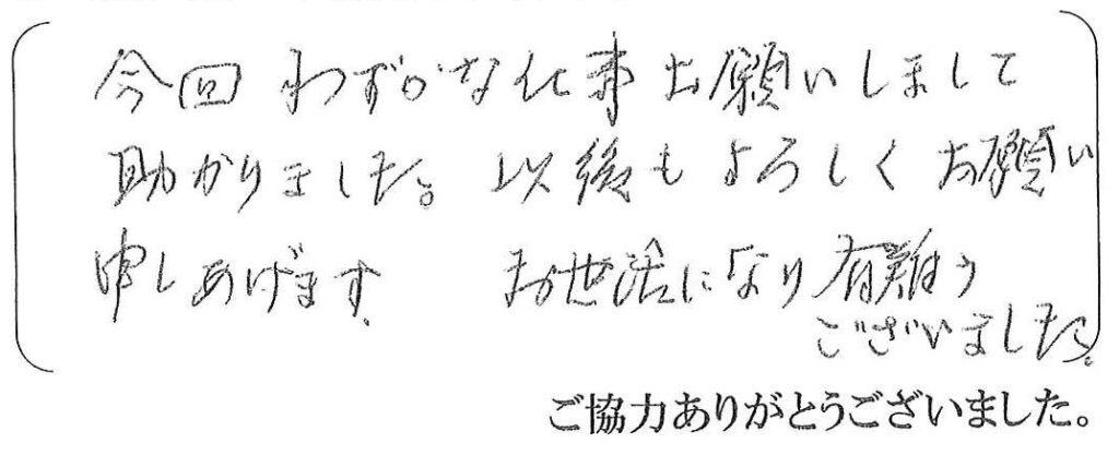 この度は工事をご依頼頂き、ありがとうございました。今回は外壁の塗装補修工事をさせて頂きました。お家のことで気になっておられた事でしたので、ご満足頂けて私も嬉しく思います。今後共、お家の事でしたらご遠慮なくご相談下さい。