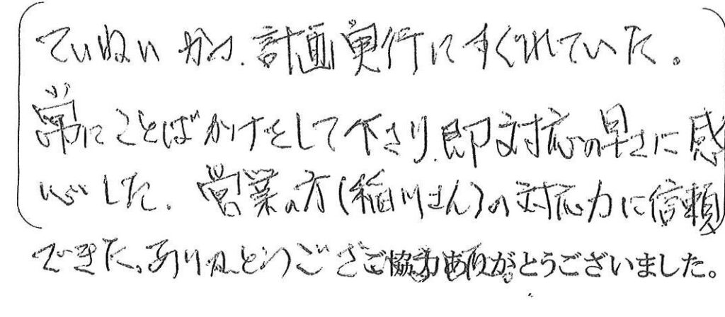 この度は外壁塗装工事をお世話になりました。既存のピンク色のアクセントから今回はオレンジ色のアクセントで、また美しくったので私も嬉しく思っております。
