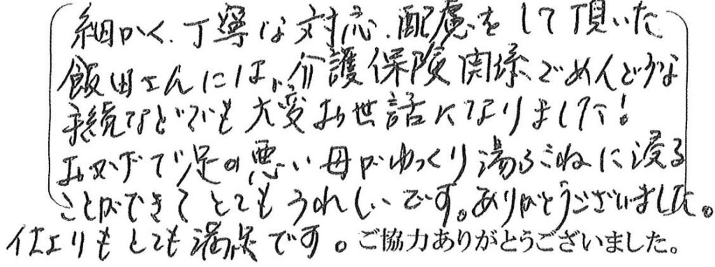 この度は浴室廻り、トイレの工事をさせて頂きました。お母様のことを第一に考え施工させて頂きました。満足して頂き光栄です。今後ともお気軽にお声を掛けて下さい。