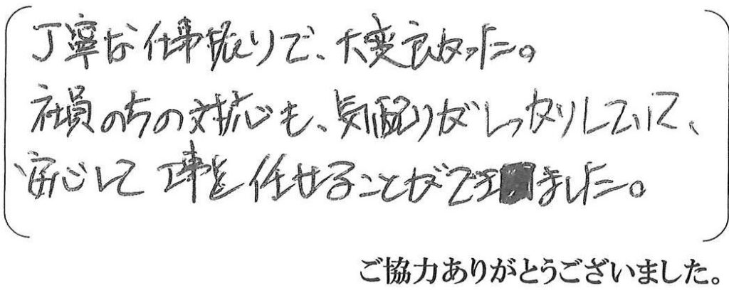 この度は、洗面所内装工事のご依頼を頂き、ありがとうございました。お客様のご助力もありスムーズに工事を進めることができました。引き続きお困りの事がございましたら、お声がけください。今後とも宜しくお願い致します。