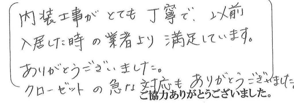 この度はトイレ・内装工事をご依頼下さいましてありがとうございました。ご希望に適う仕上りで納める事が出来、うれしく思います。今後共どうぞよろしくお願いします。