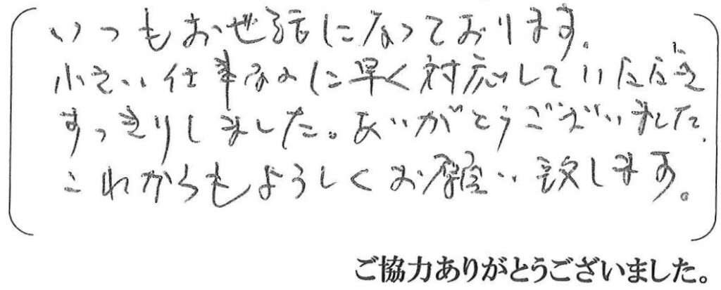 この度は、フェンス交換の工事をご用命いただきました。お庭の樹木も整理いただきスムーズに工事をさせていただく事が出来、大変ありがたく思っております。ありがとうございました。