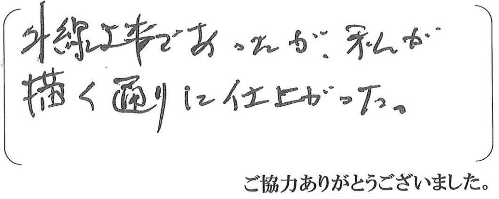 いつも大変お世話になり、ありがとうございます。この度は台風ではずれた幹線(電線)を固定する工事をさせていただきました。御主人様と密に打合せができ、色々ご協力いただけたおかげでイメージ通りに作業ができて良かったです。今後共、末永いお付き合いをよろしくお願い致します。