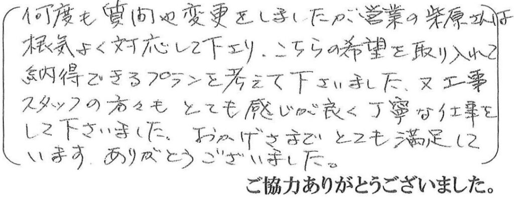 この度は、システムキッチン工事をご依頼下さいましてありがとうございました。ご納得頂けるプランと工事をご提案できとても嬉しく思います。今後共どうぞよろしくお願い致します。