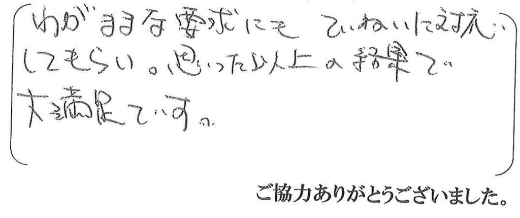 この度はLDK・内装リフォーム工事をご依頼下さいましてありがとうございました。ちょぅきの工事で大変だったと思いますが、いつも工事し易いようご配慮頂き、職方共々感謝しております。ひと続きに広く繋がったリビングがとても良く仕上がっており、嬉しく思います。今後共、末永くどうぞよろしくお願い致します。