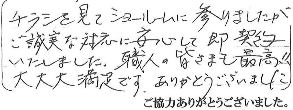 この度はキッチンのリフォーム工事をさせて頂き、ありがとうございました。工事中は、職人さんが仕事をしやすい雰囲気づくりにご協力頂き、ありがとうございました。今後とも何卒宜しくお願い致します。