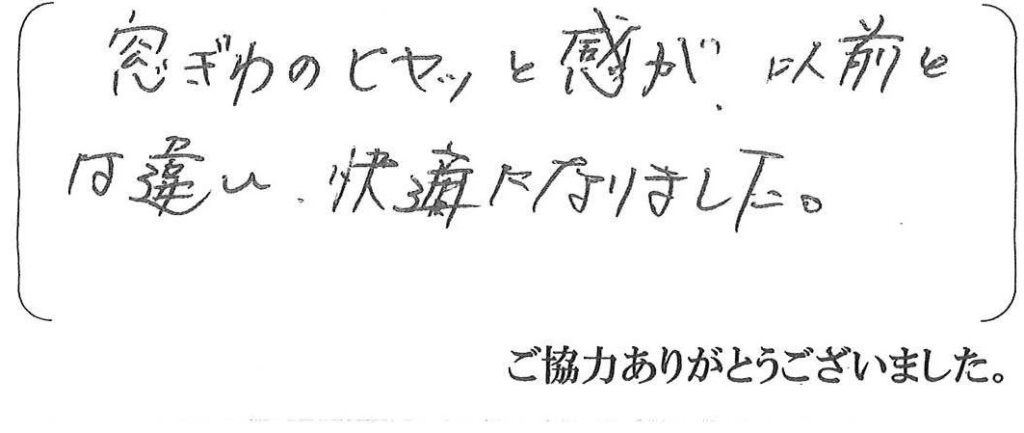 この度は内窓・勝手口ドア工事のご依頼を賜りまして誠にありがとうございました。断熱効果を実感して頂き大変嬉しく思います。今後共、よろしくお願いいたします。