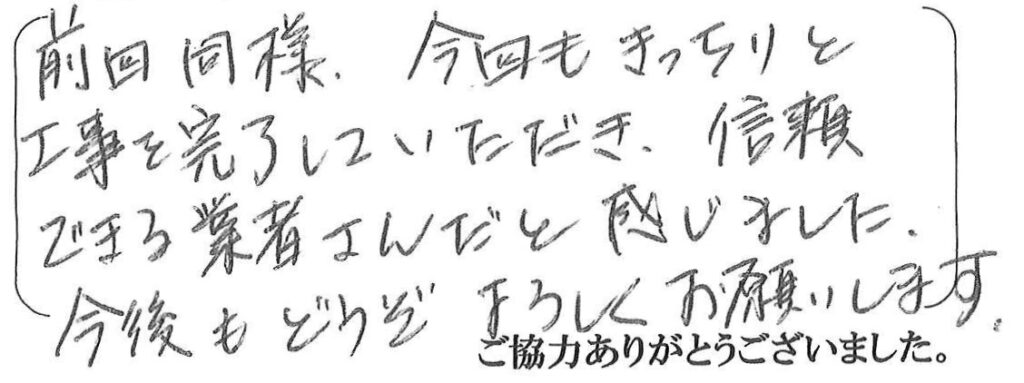 前担当者から引き継いで担当させていただきました。今回は、和室の畳をフローリングにする工事を行いました。こちらの不手際でご迷惑をおかけしてしまいましたが、ご信頼、ご満足のお声をいただき大変嬉しく思います。今後ともよろしくお願いいたします。