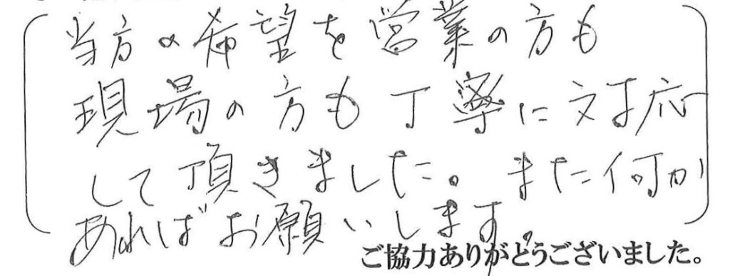 今回は、玄関ドアリフォームをご依頼下さいましてありがとうございました。外壁の色とも良く似合った木目の素敵な断熱ドアになり、お喜び頂けとても嬉しく思います。今後共どうぞよろしくお願い致します。
