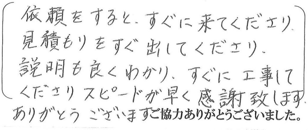 いつもありがとうございます。この度はウオシュレットが故障という事でお声掛けいただき、誠にありがとうございました。10年前の外壁塗装、そして全面改装と本当にお世話になりました。これからもお近くのホームドクターとして頑張りますので、今後共末永いお付き合いを宜しくお願い致します。