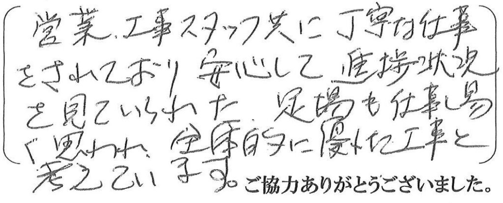この度は塗装工事をご依頼頂き、ありがとうございました。工事の際のお心遣いに感謝しております。今後とも、末永くお付き合いのほど宜しくお願い致します。