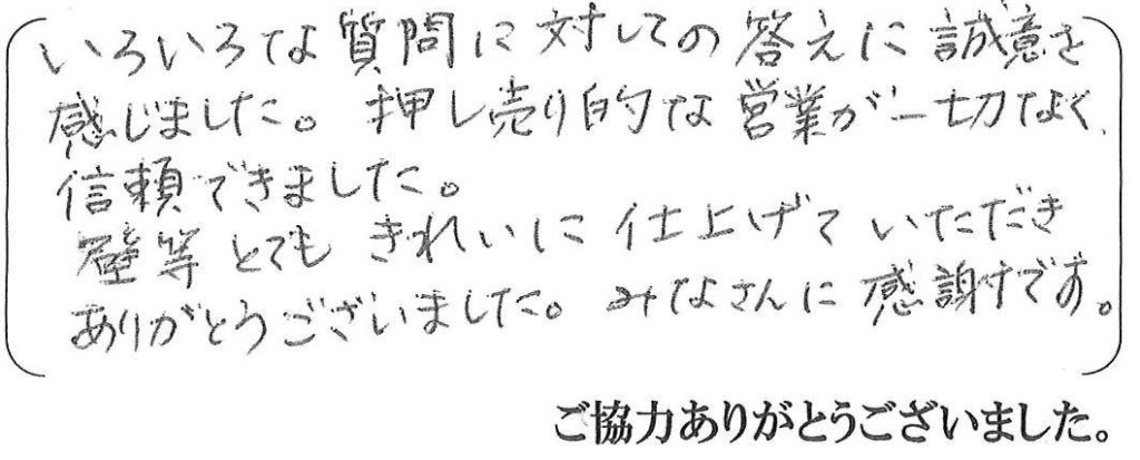 この度は外壁塗装工事のご依頼を頂き、誠にありがとうございました。また仕上がりにご満足頂けた事、大変嬉しく思います。これからもお家の事でお困り事がありましたら、ご相談ください。ありがとうございました。
